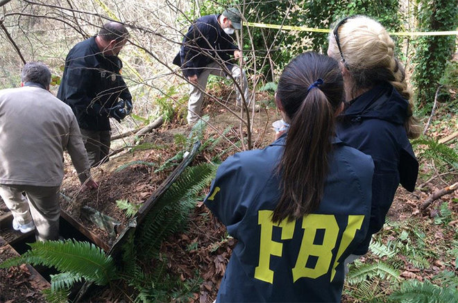 The FBI and Bureau of Alcohol, Tobacco, Firearms, and Explosives (ATF) developed information during the investigation that suggested Robinett had buried a cache of materials related to his crimes near Lake Sammamish in Sammamish, Washington. Together with the ATF, Sammamish Police Department, King County Sheriff’s Office, and Washington State Patrol, the FBI’s Evidence Response Team explored an area of King County wetlands behind a condominium development on Lake Sammamish. They uncovered the bunker and removed more than a dozen large storage containers for further evidence processing.