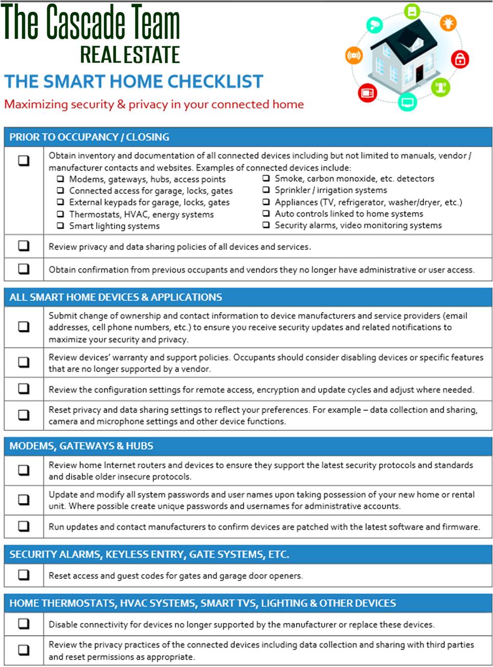 The checklist includes an overview of things to do prior to closing; smart home devices and applications; modems, gateways, and hubs; security alarms, keyless entry, gate systems; and home thermostats, HVAC systems, smart TVs, lighting, and other devices.