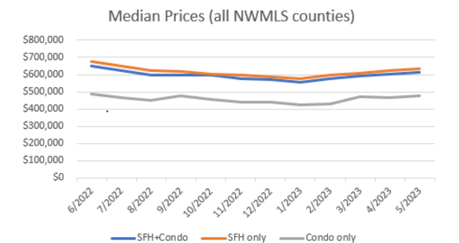Northwest MLS statistics for May show the area-wide median price of $615,000 is down 6.8% from the year-ago figure of $660,000, but it’s up nearly 10.4% since January when the median sales price was $557,250. The figures reflect sales of single family homes and condominiums across 26 counties.