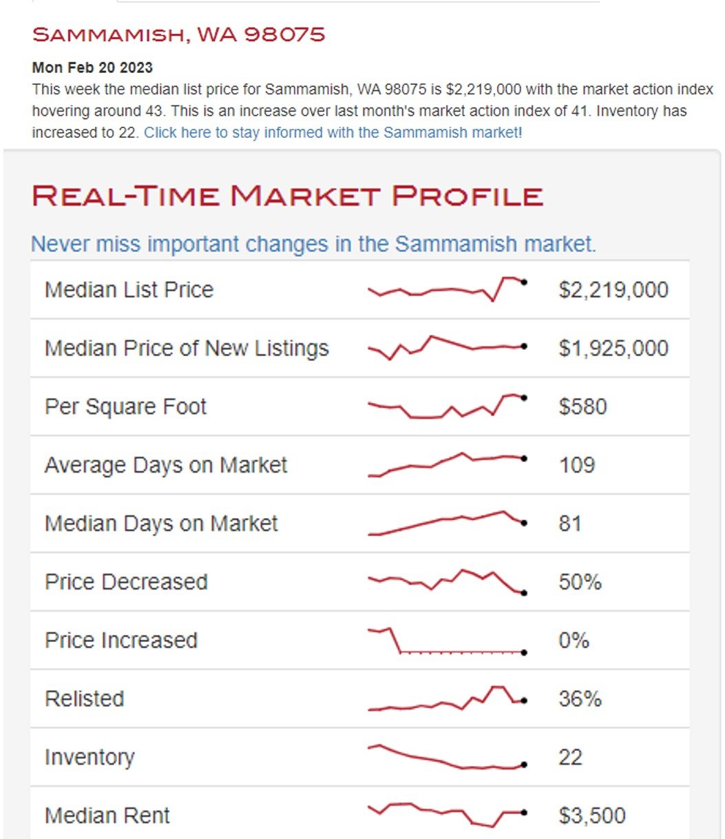 The latest data for Sammamish, WA shows that the share of home sellers making a price reduction was more than twice as large as one year ago. Indeed, 50% of sellers in have slashed their prices compared with only 6% a year earlier.