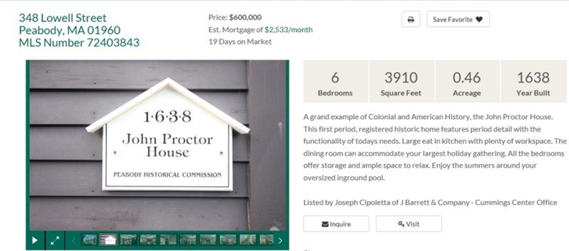 According to the real estate listing (with photos), the 3910-square-foot, three-story, First Period (built between 1626 and 1725) colonial-style (duh) Proctor Hone was built in 1638 (when Peabody was part of Salem) and has six bedrooms, two baths, a two-car garage, a patio and a built-in pool. Located on the banks of what is now called Proctor Brook, it has obviously been updated and remodeled since the Proctors lived there – what family accused of witchcraft wants a witch-testing pool in their backyard?