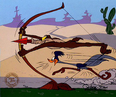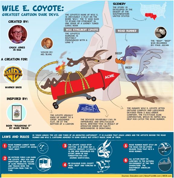 Coyote posting signs such as "Detour" or "Free Bird Seed"