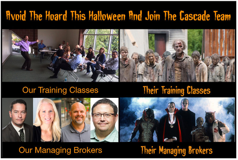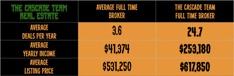 Make this Halloween the year you finally elevate your career with increased sales and income by joining The Cascade Team. We'll show you exactly how our brokers outperform the average agent and keep more money in their pockets. We have first year agents make 6 (Six) figure incomes right out the gate on a regular basis.