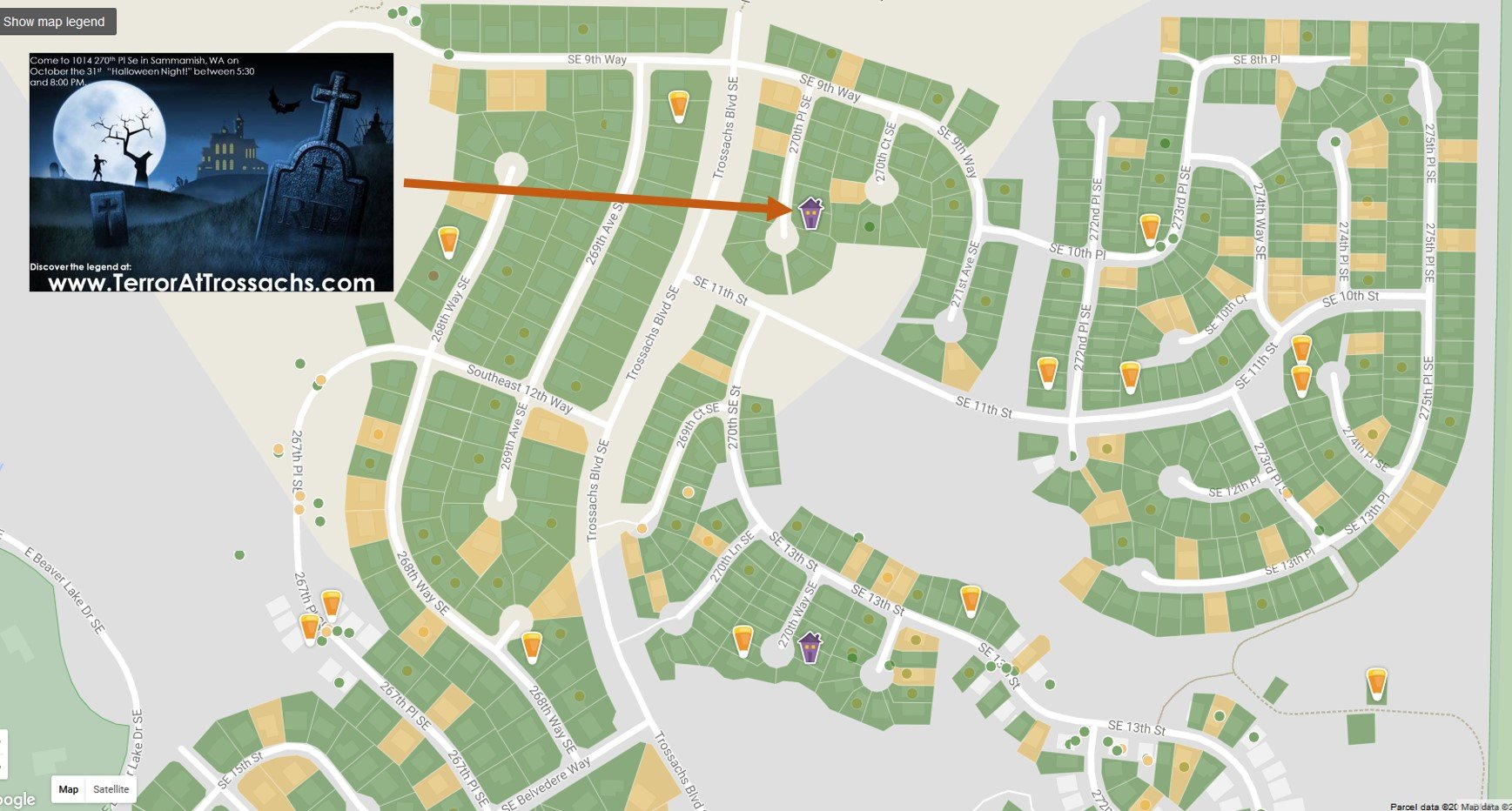 If you are brave or foolish enough, come to 1014 270th Pl SE in Sammamish, WA on October the 31st “Halloween Night!”. Take a guided tour and venture between the homes in search of “The Haunted Graveyard”. If you do dare, frights are assured, as well as the potential for fantastic rewards………