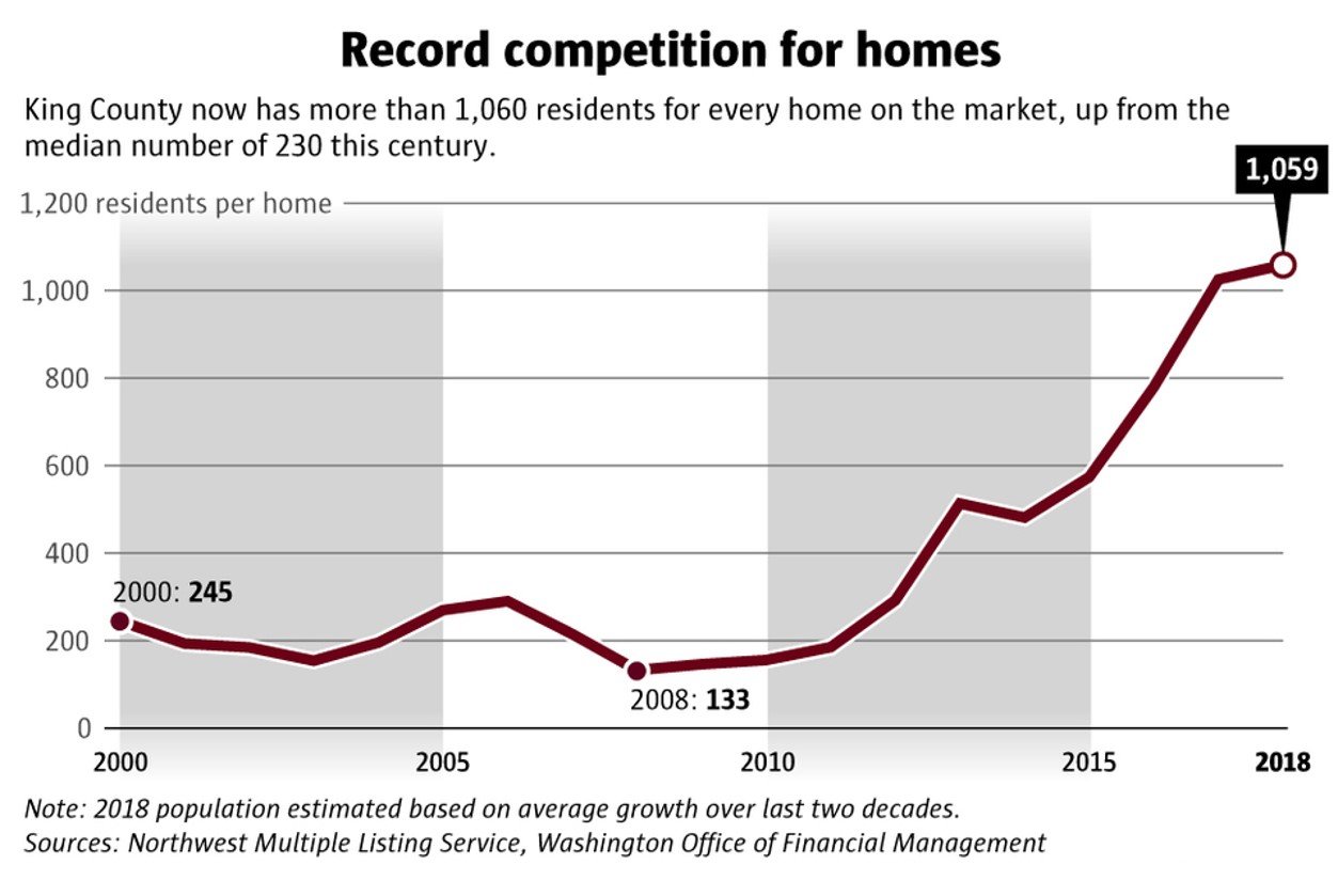 A basic beginner's explanation for our soaring home prices in King County: There are a lot more people searching for homes, and far fewer homes available for them to buy.