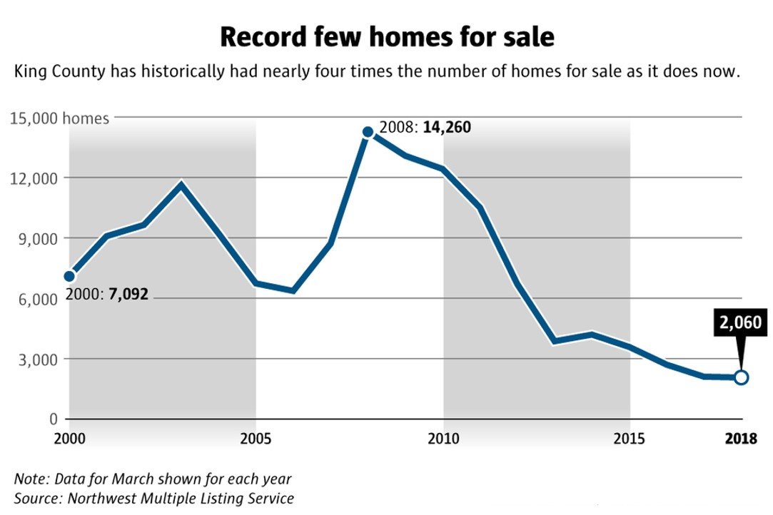King County had only about 2,000 homes (single-family and condo) for sale last month. During the average month of March over the last two decades, the region had more than 7,800 homes for sale — nearly four times as many.
