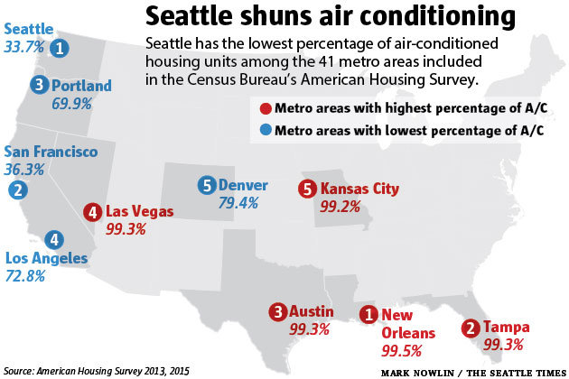 Still, when it comes to A/C, most people living the Puget Sound area have the same almost reflexive response — “It only gets really hot for a few days, so who need air-conditioning?” — which is why as a whole homes in our area of the country only have A/C at about a third the national rate.