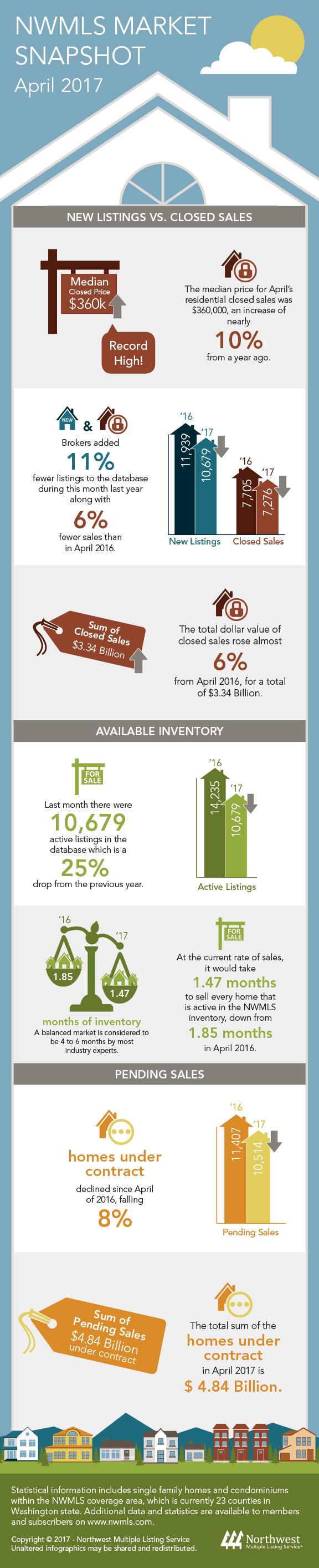 KIRKLAND, Washington (May 4, 2017) – “Frustrating” is how brokers are summarizing the mood of buyers, brokers – and industry professionals – during the current housing market frenzy. New statistics from Northwest Multiple Listing Service show declines in inventory and sales, while prices continue their upward trajectory, but those numbers only tell part of the story.