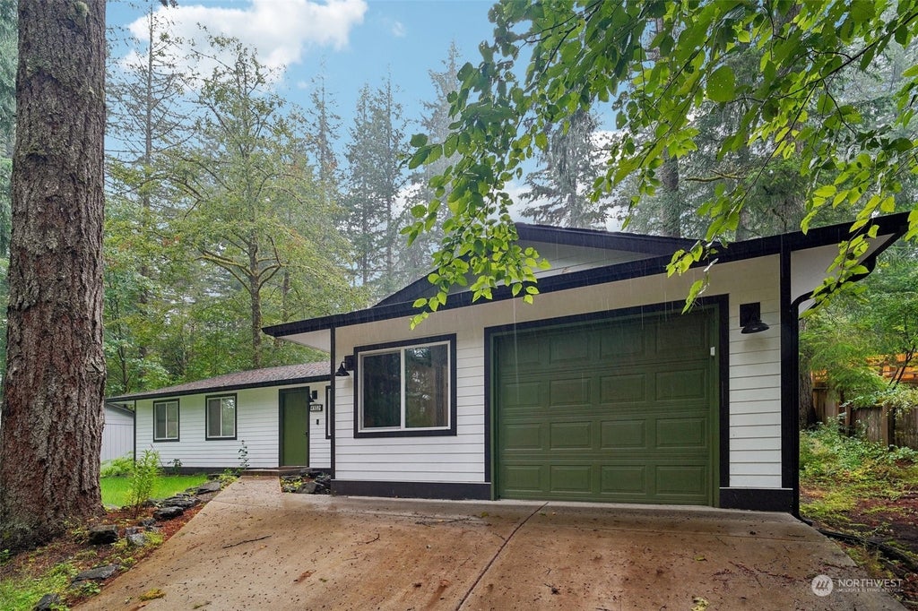 Stylishly renovated rambler w/ serene seclusion in North Bend. Elongated driveway is surrounded by fresh landscaping and lush foliage. Boasting numerous updates: new roof, siding, fresh paint, windows, water heater, and a newly paved driveway and entry walk. Inside, laminate hardwood flooring throughout, natural light & living room with electric fireplace and beautiful wood mantle detail. Kitchen features crisp white cabinetry, SS appliances, quartz countertops, and a walk-in pantry. The full bath includes a dual sink vanity. Primary suite w/ two closets, tile shower, and dual sink vanity. French doors off the dining room lead to a brand-new deck and private backyard. The finished one-car garage provides covered parking and storage.